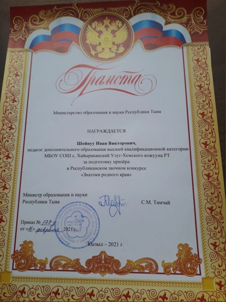 Педагог дополнительного образования Хайыраканской МБОУ СОШ Шойнуу Иван Викторович занял 1 место в Республиканском конкурсе исследовательских работ и проектов «Топонимика родного края».
