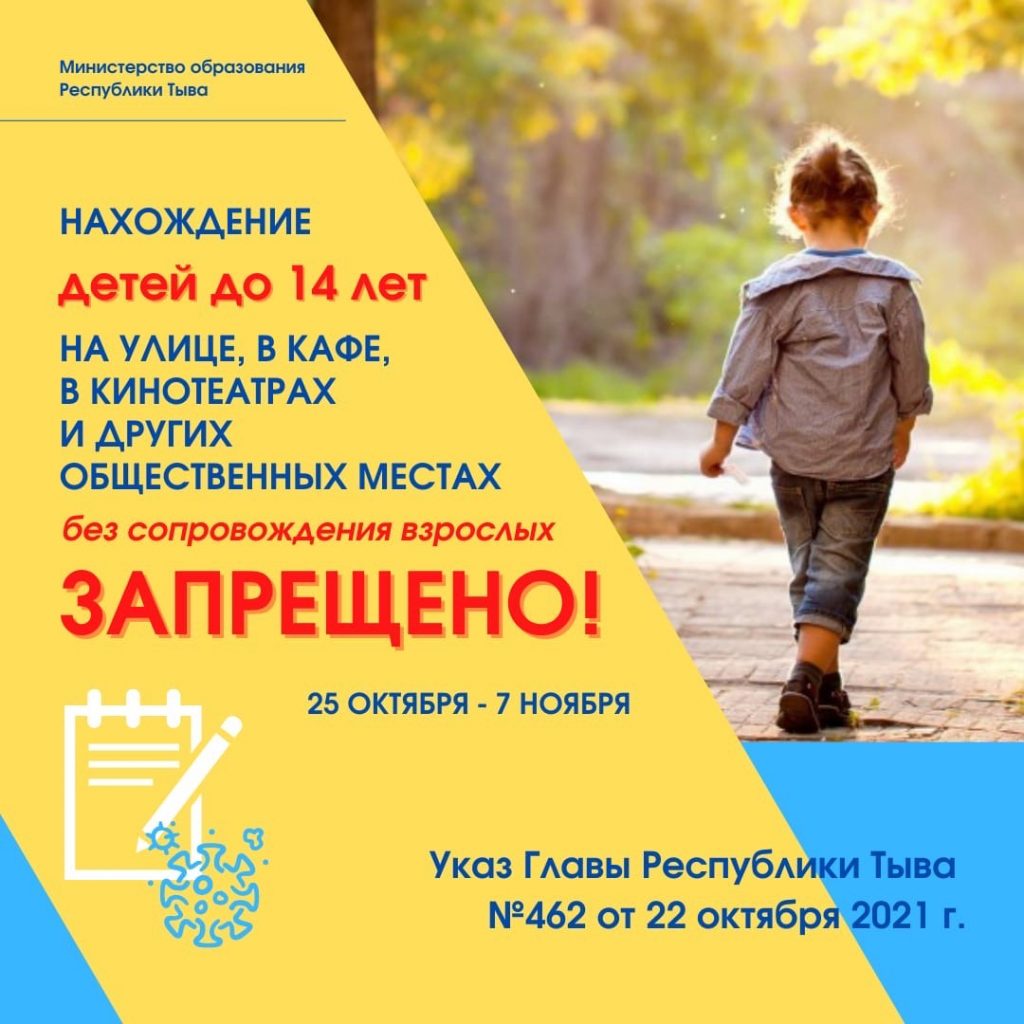 Хундулуг ада-ие!!! Тыва Республиканын Баштынынын октябрь 22де ундургени 462 дугаарлыг доктаалы езугаар октябрь 25-тен ноябрь 7-ге чедир дыштанныр хуннерни чарлааны-биле кожуун девискээринде шагдаа ажылдакчылары болгаш ПДН инспекторлары хой-ниити черлеринде, кудумчуларда хыналда унуушкуннерни чорудуп турар. Ынчангаш, назы-хар четпээн уругларынарны садыг-саймаа черинче, кудумчуже улуг кижинин уделгези чокка ундурбезин база катап дилеп, сагындырып тур бис. Бир эвес назы-хар четпээн уруг улуг кижинин уделгези чокта чааскаан чоруур таварылгада, ада-иеге хамаарыштыр хулээлгелерин чедир куусетпээни-биле административтиг торгаалды онаап болур. Бугу делегейде аарыгның тарап нептерээнин чавырылдырары-биле октябрьның 30-ден ноябрь 7-ге чедир дыштаныр хүннерни чарлаанын утпаалынар.