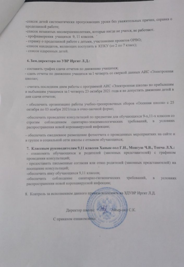 Согласно приказу директора школы от 23 октября 2021года №519 «О сдаче отчетов за 1 четверть 2021-2022 уч.года», №521 «Об организации учебно-тренировочных сборов «Осенняя школа» в период осенних каникул с 25 по 03 ноября с письменного согласия родителей организованы консультации для обучающихся 9,11 классов.
