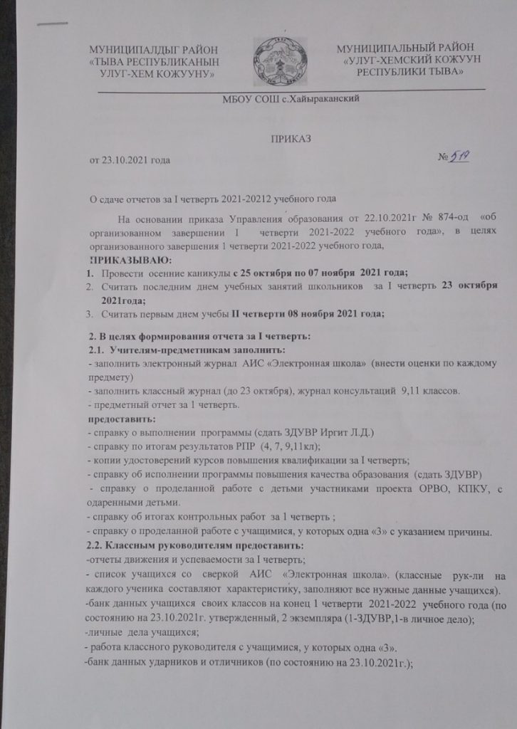 Приказ Управления образования от 22 октября №2021года № 874-ОД «Об организованном завершении 1 учебной четверти 2021-2022 учебного года»