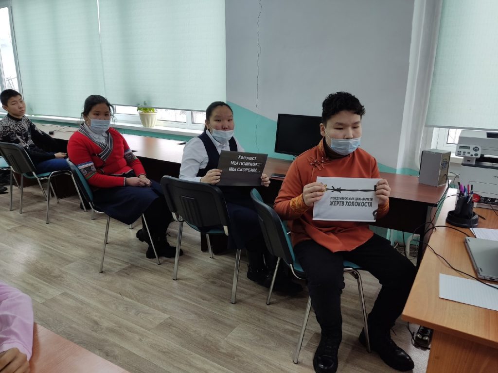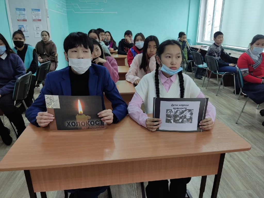 Сегодня 19 января 2022 года под руководством ЗДППВ Дюсюповой В. Р., учителем истории Конгаа А-С. Ю. в 8-9 классах проведен урок памяти приуроченной Международному дню памяти жертв Холокоста и годовщине освобождения Красной Армией лагеря смерти «Аушвиц», в целях воспитания чувства уважения и сострадания к памяти жертв Холокоста, а также осознания важности сохранения памяти о Холокосте.