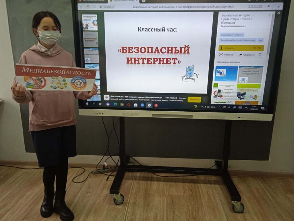 С 17 по 22 января 2022года проводится «Неделя медиабезопасности и кибербезопасности», в целях обеспечения информационной безопасности несовершеннолетних обучающихся путем привития им навыков ответственного поведения в современной информационно-телекоммуникационной среде. В 8 » А» классе урок медиабезопасности и кибербезопасности провел практикант Бадарчы М. М.