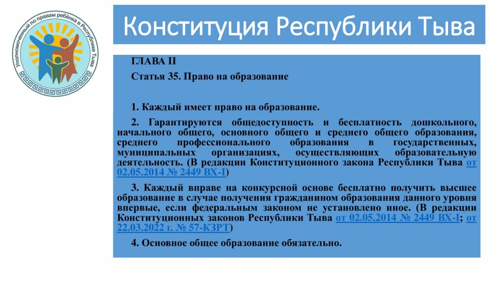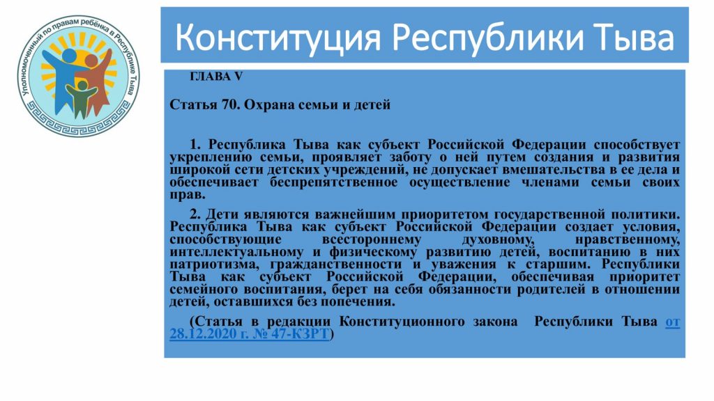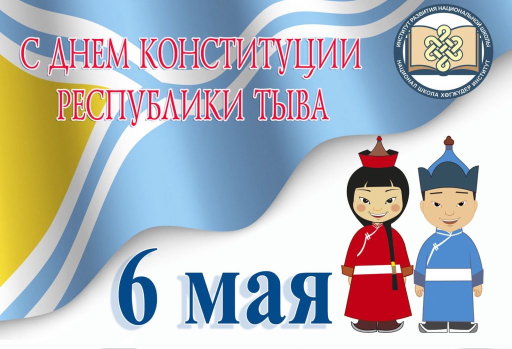 Уважаемые родители, учителя и учащиеся!!!! Ежегодно 6 мая мы отмечаем государственный праздник – День Конституции Республики Тыва. Эта дата объединяет нас, жителей республики, мы в этот день чувствуем особую причастность и ответственность за судьбу своей малой родины. Наша общая задача – беречь ценности и реализовать в жизни положения Основного закона, прививать любовь к Родине, гражданскую ответственность подрастающему поколению. Поздравляем вас с государственным праздником – Днем Конституции Республики Тыва!
