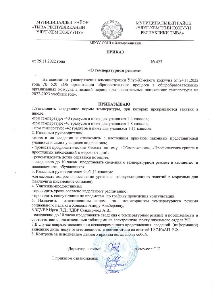 В соответствии с Распоряжением администрации Улуг-Хемского кожууна от 24 ноября 2022 года №520 «Об организации образовательного процесса в общеобразовательных организациях кожууна в зимний период при значительных понижениях температуры на 2022-2023 учебный год» установлены ограничения посещения обучающимися общеобразовательных организаций в зимний период при следующих температурах: