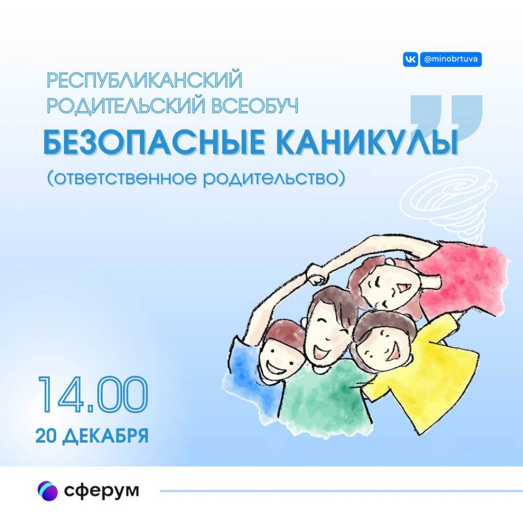 В преддверии новогодних мероприятий в образовательных организациях и зимних каникул обучающихся 20 декабря т.г. в 14.00 ч. в Министерстве образования Республики Тыва состоится ежегодный республиканский родительский Всеобуч на тему: «Безопасные каникулы» (Ответственное родительство).