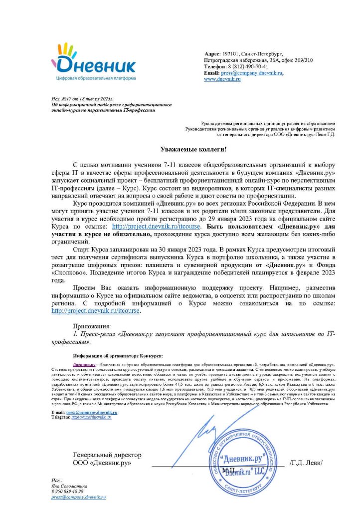 Цифровая образовательная платформа «Дневник.ру» (выпускник Фонда «Сколково») подготовила бесплатный онлайн-курс для школьников 7-11 классов и их родителей по IT-профессиям. Он состоит из видеороликов, в которых IT-специалисты разных направлений отвечают на вопросы о своей работе и дают советы по профориентации. Курс составлен на основе опроса школьников и родителей, проведенного на «Дневник.ру» в мае 2022 года. В нем приняли участие 1,5 тыс. человек из 33 регионов России, которые рассказали, о каких специальностях им интересно узнать из первых уст профессионалов. Таким образом отобрано 14 IT-профессий, среди которых: веб-разработчик, разработчик мобильных приложений, аналитик, QA-инженер, UI/UX-дизайнер, продакт-менеджер, проджект-менеджер, solution-архитектор, продуктовый маркетолог, веб-дизайнер, специалист по информационной безопасности, системный администратор, администратор баз данных и DevOps-инженер. Гавриил Леви, CEO и генеральный директор «Дневник.ру»: «Опрос показал, что дети и взрослые хотят спросить у разных IT-специалистов. На курсе коллеги из команды «Дневник.ру» ответят на эти вопросы и помогут ребятам понять, к чему есть способности и как их развивать». Зарегистрироваться на курс можно по ссылке: https://vk.cc/ckMEsG. Заявки принимаются до 29 января 2023 года, а курс стартует 30 января. Татьяна Низяева, директор Департамента социальной и образовательной политики Фонда «Сколково»: «Обучение IT-профессиям школьников – современный тренд развития образования, поэтому очень важно дать «начинающим взрослым» как можно больше информации о том, какие в этой сфере есть профессии и перспективы. Ведь в IT огромное разнообразие специальностей: и творческих, и аналитических, но многие школьники просто о них не знают. Инициатива «Дневник.ру» призвана исправить ситуацию». Выполнив итоговый тест после выхода всех видеороликов курса, школьники смогут получить сертификат в свое портфолио, а также принять участие в розыгрыше планшета и памятного мерча. Для этого нужно отправить на почту press@company.dnevnik.ru краткое эссе о том, какая IT-профессия заинтересовала участника и почему, как он планирует в ней развиваться и как в этом может помочь цифровая образовательная платформа «Дневник.ру». В конце курса для участников пройдет вебинар с экспертами IT-отрасли, на котором можно будет задать дополнительные вопросы об IT-профессиях и узнать результаты розыгрыша. Ознакомиться с подробной информацией и положением о курсе можно на официальном сайте: https://project.dnevnik.ru/itcourse. Справочная информация Дневник.ру – бесплатная цифровая образовательная платформа для образовательных организаций, разработанная компанией «Дневник.ру». Система предоставляет пользователям круглосуточный доступ к оценкам, расписанию и домашним заданиям. С ее помощью легко планировать учебную деятельность и обмениваться школьными новостями, общаться в чатах по учебе, проводить дистанционные уроки, закреплять полученные знания с помощью онлайн-тренажеров, проводить оплату питания, использовать другие удобные в обучении сервисы и приложения. На платформах, разработанных компанией «Дневник.ру», зарегистрировано более 41,5 тыс. школ из разных регионов России, 6,5 тыс. школ Казахстана и 6 тыс. школ Узбекистана, в общей сложности ими пользуются свыше 1,6 млн преподавателей, 15,3 млн учащихся, и 10,5 млн родителей. Росс