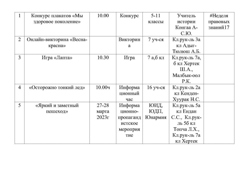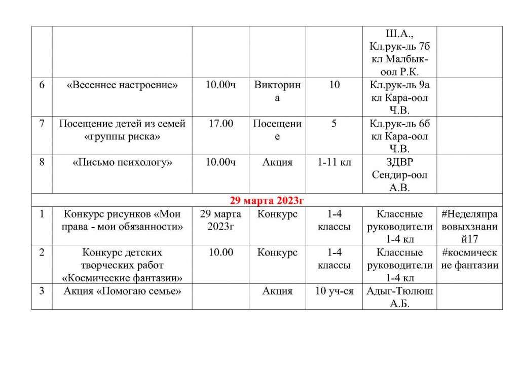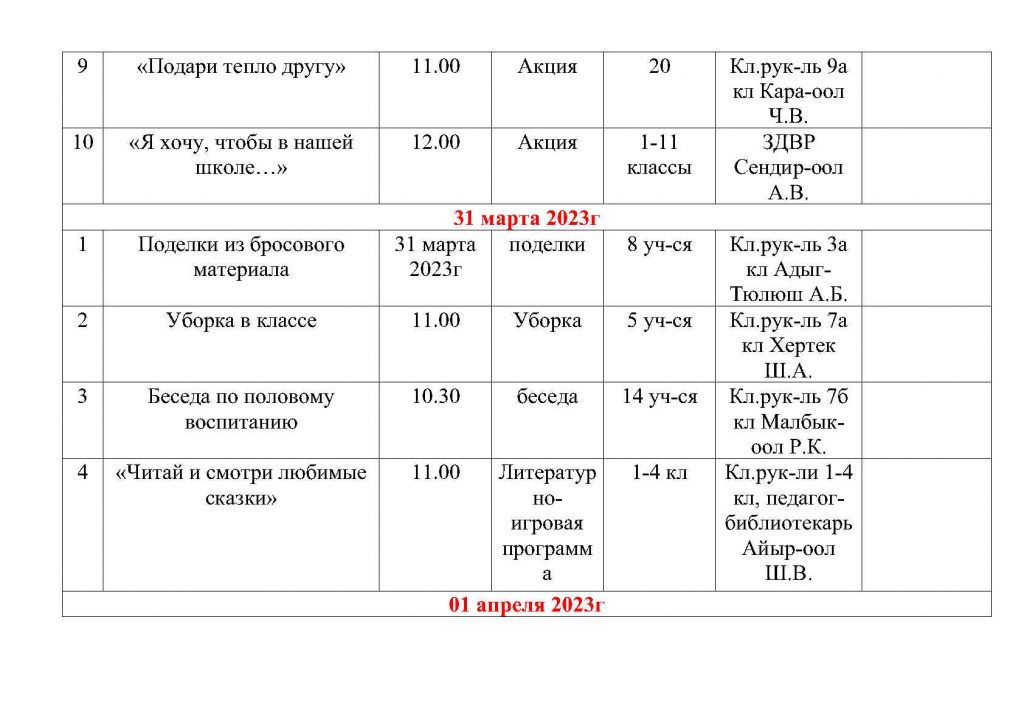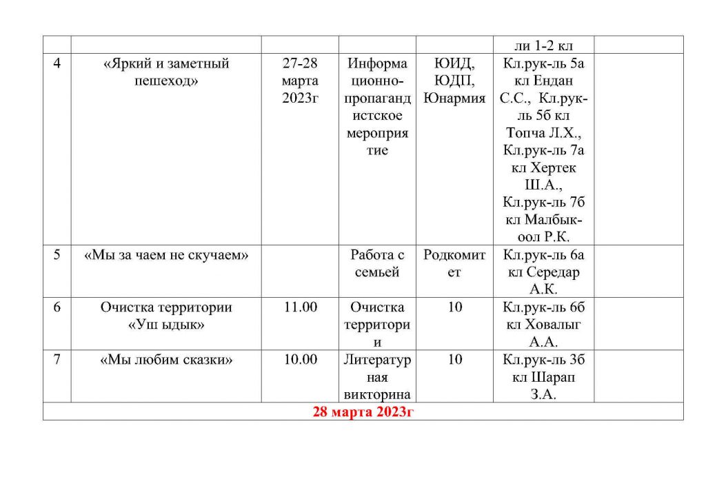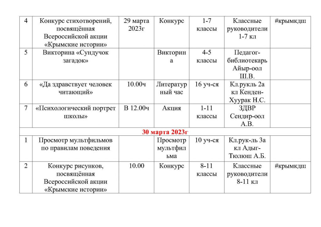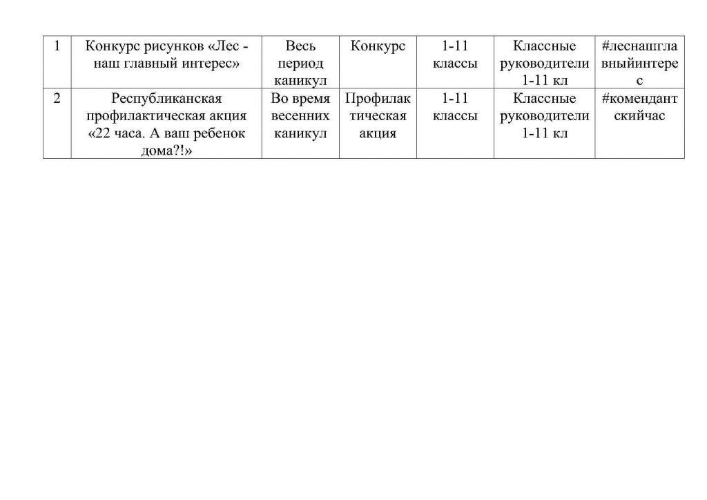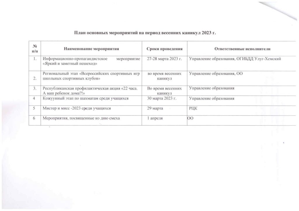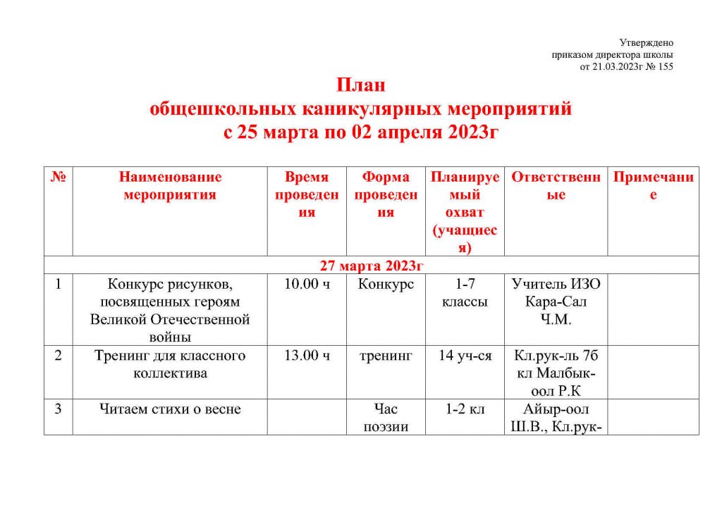 План общешкольных каникулярных мероприятий с 25 марта по 02 апреля 2023г