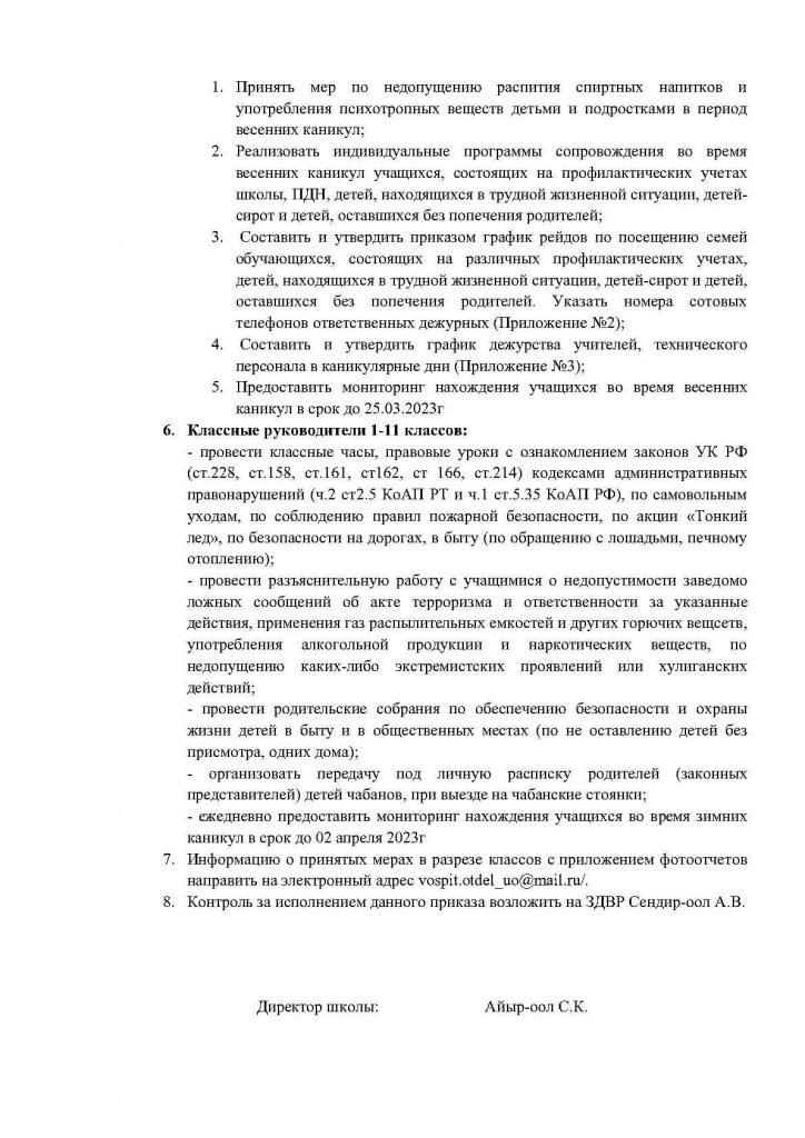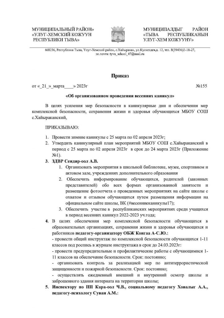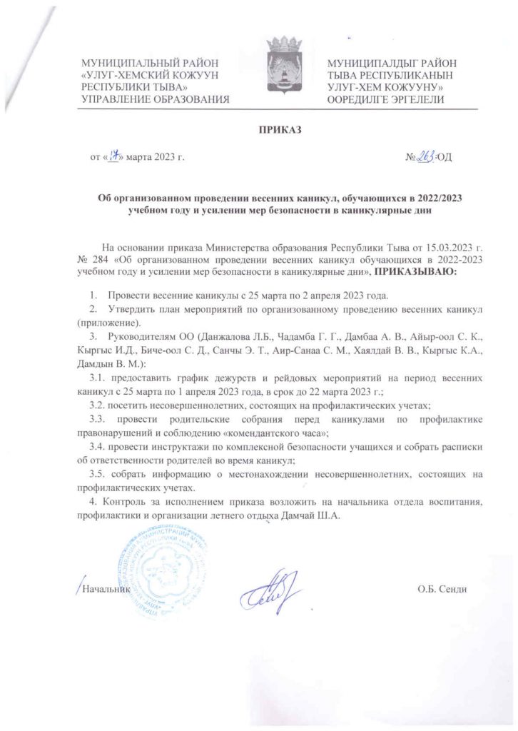 Приказ №263 «Об организованном проведении весенних каникул, обучающихся в 2022-2023 учебном году и усилении мер безопасности
