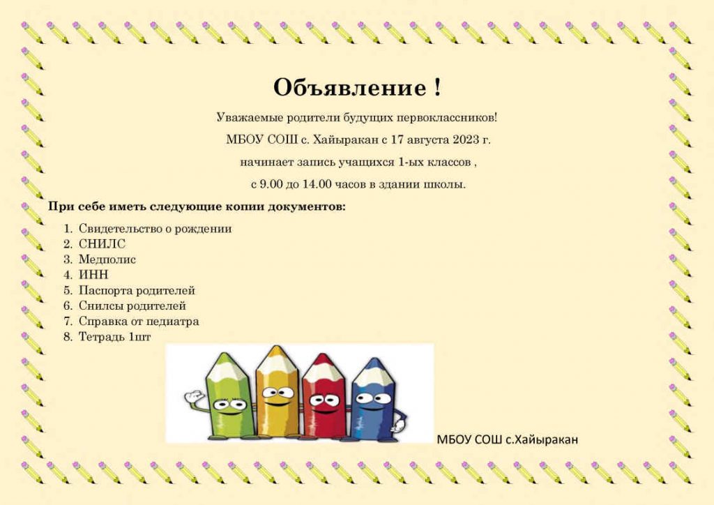 С 16 августа 2023 года на основании приказа Управления образования от 28.07.2023 г.№580-ОД «О проведении благотворительной акции «Помоги собраться в школу», посвященного началу нового 2023-2024 учебного года в ОО Улуг-Хемского кожууна», в целях оказания помощи в приобретении школьной формы детям из многодетных и малоимущих семей для своевременной подготовки детей к началу нового учебного года в МБОУ СОШ с.Хайыракан стартовала акция «Помоги собраться в школу».