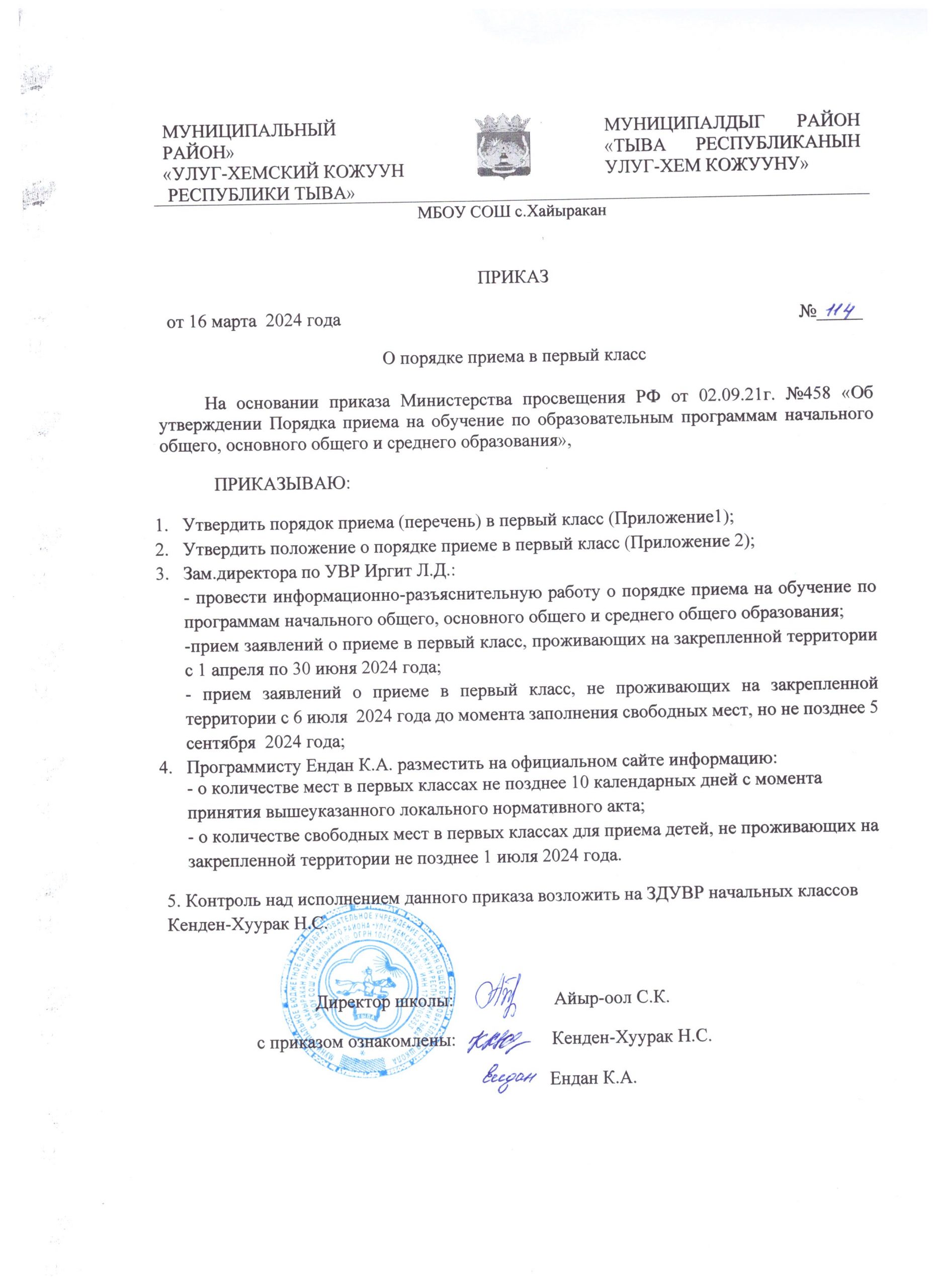 Ответственный по вопросам приема детей в 1 класс в школе — зам. директора по УВР Саая Сайзаана Сергеевна
